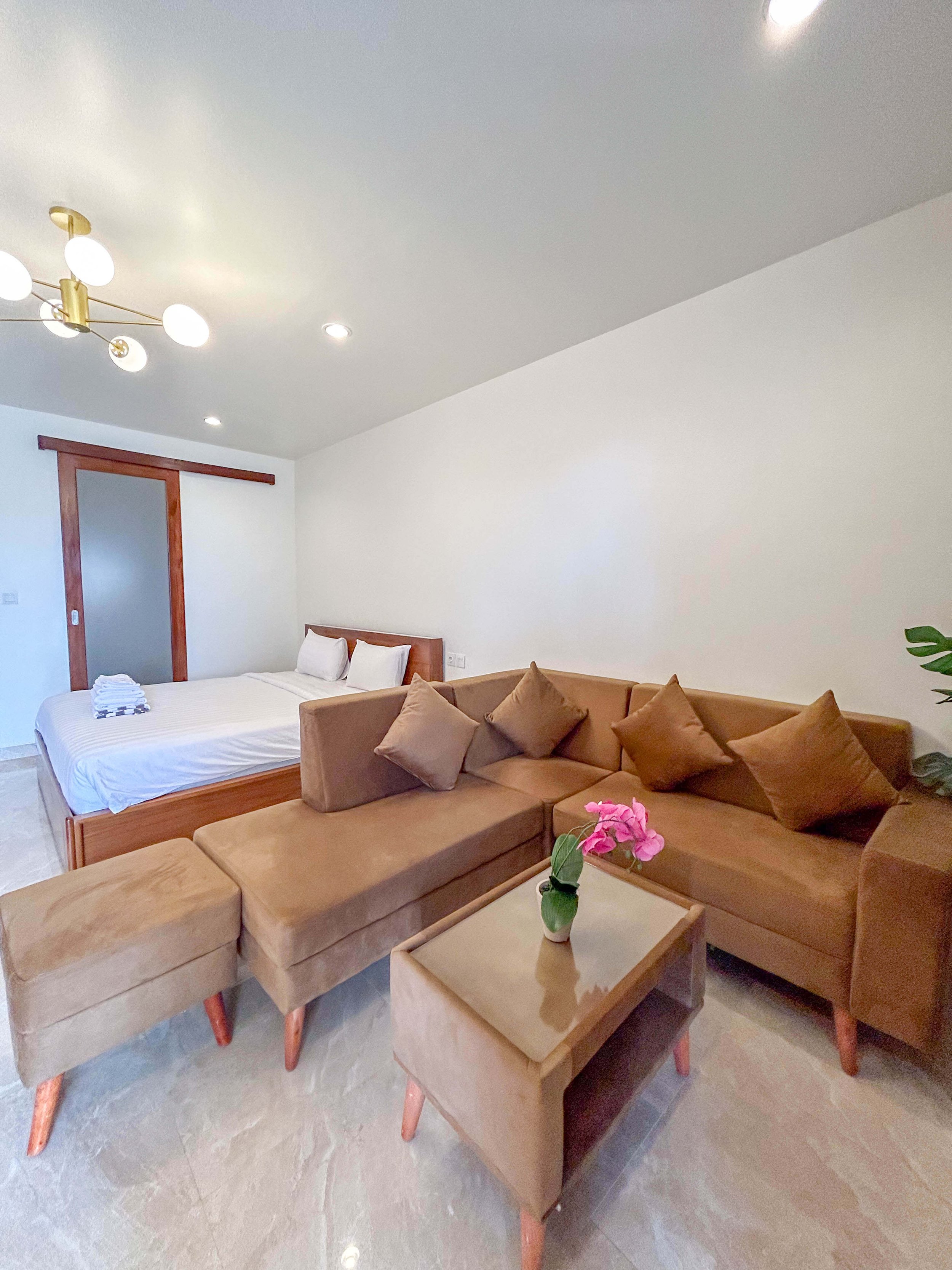 A compact, self-contained studio with modern furnishings